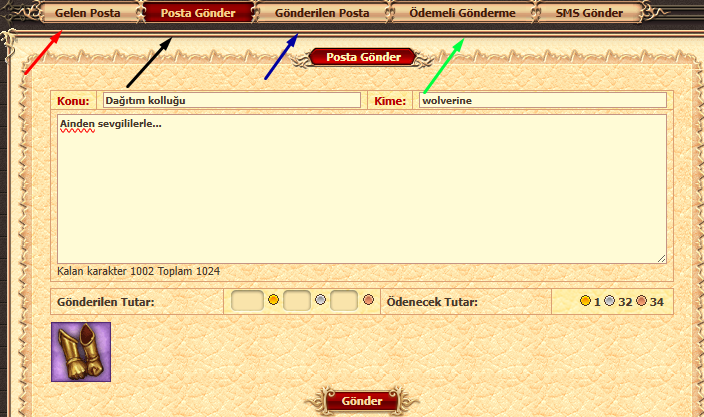 Cevap: Resimde göründüğü üzere; Kırmızı ok ile gösterilen yerden tarafınıza gelen postaları görüntülemektesiniz. Siyah ok ile gösterilen yerden; Posta gönderimleri sağlamaktasınız, buradan baştaki kısma postanın konusunu sağ taraftaki kime: seçeneğinden postanın gönderileceği oyuncuyu bu kısımların altından ise postanın içeriğini yazı ve nesne eklemesi yaparak sağlayabilirsiniz. Mavi ok ile gösterilen yerden; Tarafınıza gönderilmiş olan postaları görüntüleyebilirsiniz. Yeşil ok ile gösterilen yerden; Normal posta gönderimindeki gibi ilk önce bir konu sonra göndereceğinizi kişi seçmelisiniz, sonrasında nesne seçimi sağlayıp tutar kısmına karşı tarafın bu nesneyi alması için ödemesi gereken tutarı yazmanız gereklidir.