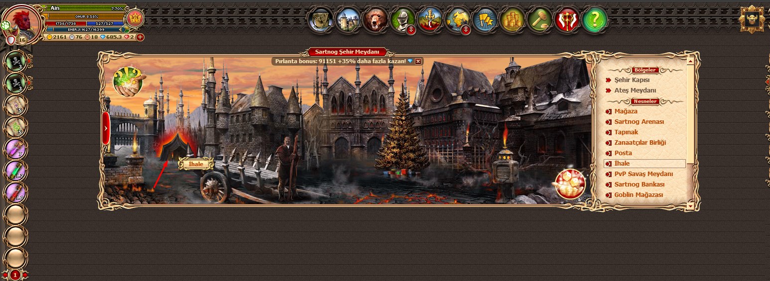 Cevap: Oyun içerisinde İhaleler, şehir meydanlarında yer almaktadır, görseldeki gibi bölge üzerinden İhale ile etkileşime girebilir veya sağ taraftan bina listesinden işlem yapabilirsiniz.