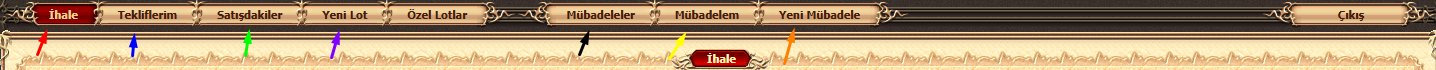 Cevap: Resimde kırmızı ok işareti ile gösterilen yer: İhale anasayfa olmaktadır, buradan diğer oyuncuların ihale üzerinden kayıt ettiği nesneleri görebilir, onları satın alabilir, teklif verebilirsiniz. Mavi ok işareti ile gösterilen yer: İhale üzerinden teklif verdiğiniz nesneleri sizlere göstermektedir, bu pencereyi yalnızca sizler görebilirsiniz. Yeşil ok işareti ile olan yer: İhale üzerinden satışta olan nesnelerinizi göstermektedir, nesnelerinizin satışta kaç dakika-saat duracağını göstermektedir, ayrıca bu kısım üzerinden nesnelerinize gelen teklifleri görebilirsiniz. Mor ok işareti ile gösterilen yer: İhaleye nesne kaydetmenize yaramaktadır, (alt satırda durum ile alakalı örnek resimler yer alacaktır.) Siyah ok işareti ile olan yer: Güncel ırkınız içerisinde açılmış olan mübadeleleri göstermektedir, buradan nesne araması yapabilirsiniz. Sarı ok işareti ile gösterilen yer: Sizlerin açmış olduğu mübadeleleri temsil etmektedir. Buradan açmış olduğunuz mübadelelerinizde ilerlemeleri ve kalan dakikayı görebilirsiniz. Turuncu ok işareti ile gösterilen yer ise: Mübadele açmanıza yaramaktadır, nesne ve açılacak adeti belirttikten sonra buradan mübadelelerinizi oluşturabilirsiniz.