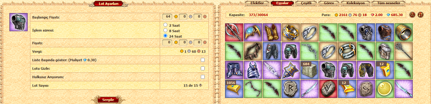 Resimde gözüken yer ihale üzerinden eşyalarınızı satışa sunduğunuz kısım olmaktadır. Buradan satışa sunacağınız nesnenizi seçip, İşlem süresini 2 saat, 8 saat veya 24 saat olarak ayarlayabilirsiniz, nesneleriniz sizleri seçtiği süre boyunca ihalede gözükecektir. Ayrıca 0.30